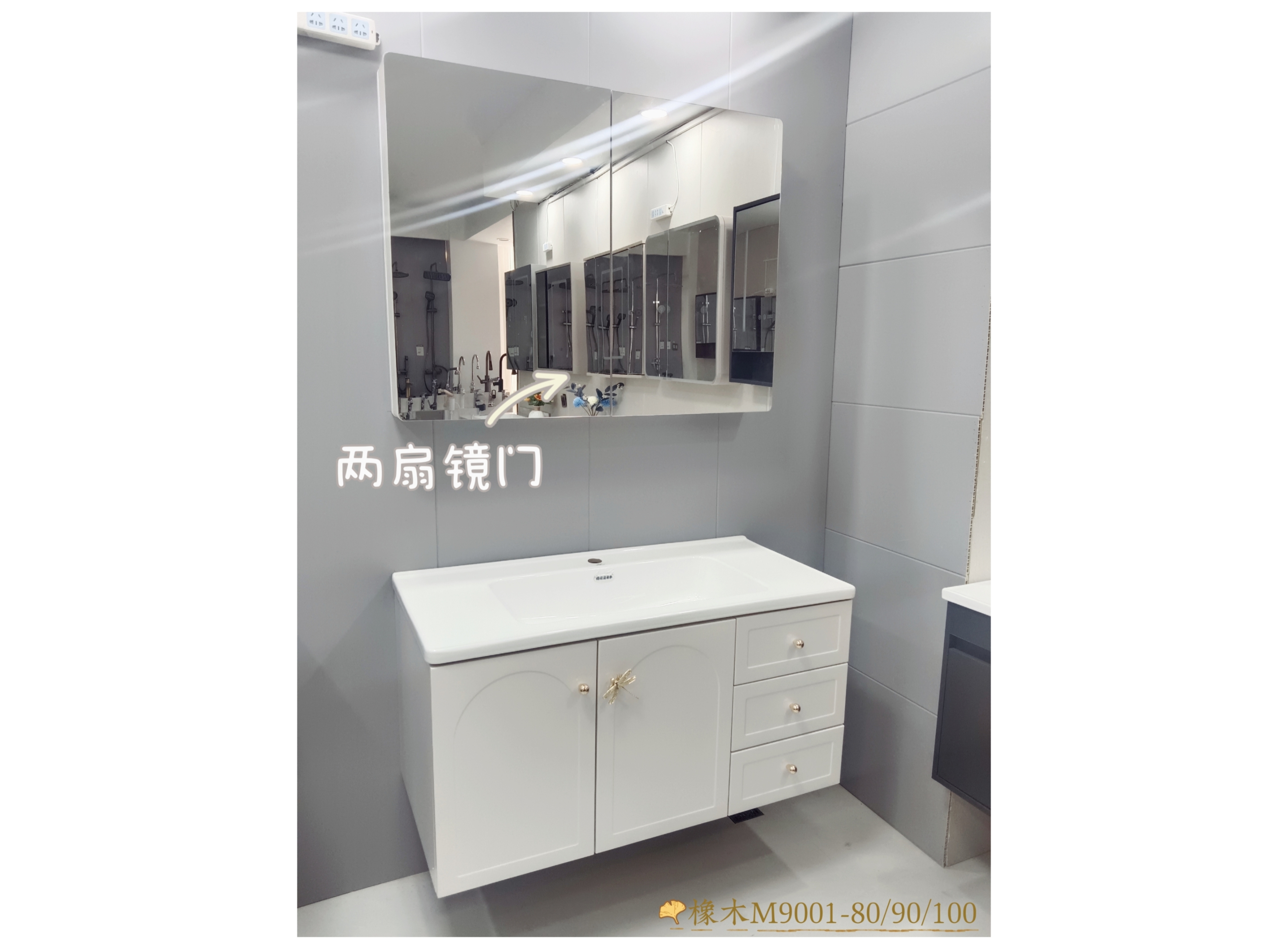 橡木款-白色,80-90-100三种尺寸、三种颜色,搭配50宽陶瓷盆。80尺寸:一门三抽两扇镜柜门。三个抽屉中上面的一个抽屉是假抽,下面两个可以拉开。