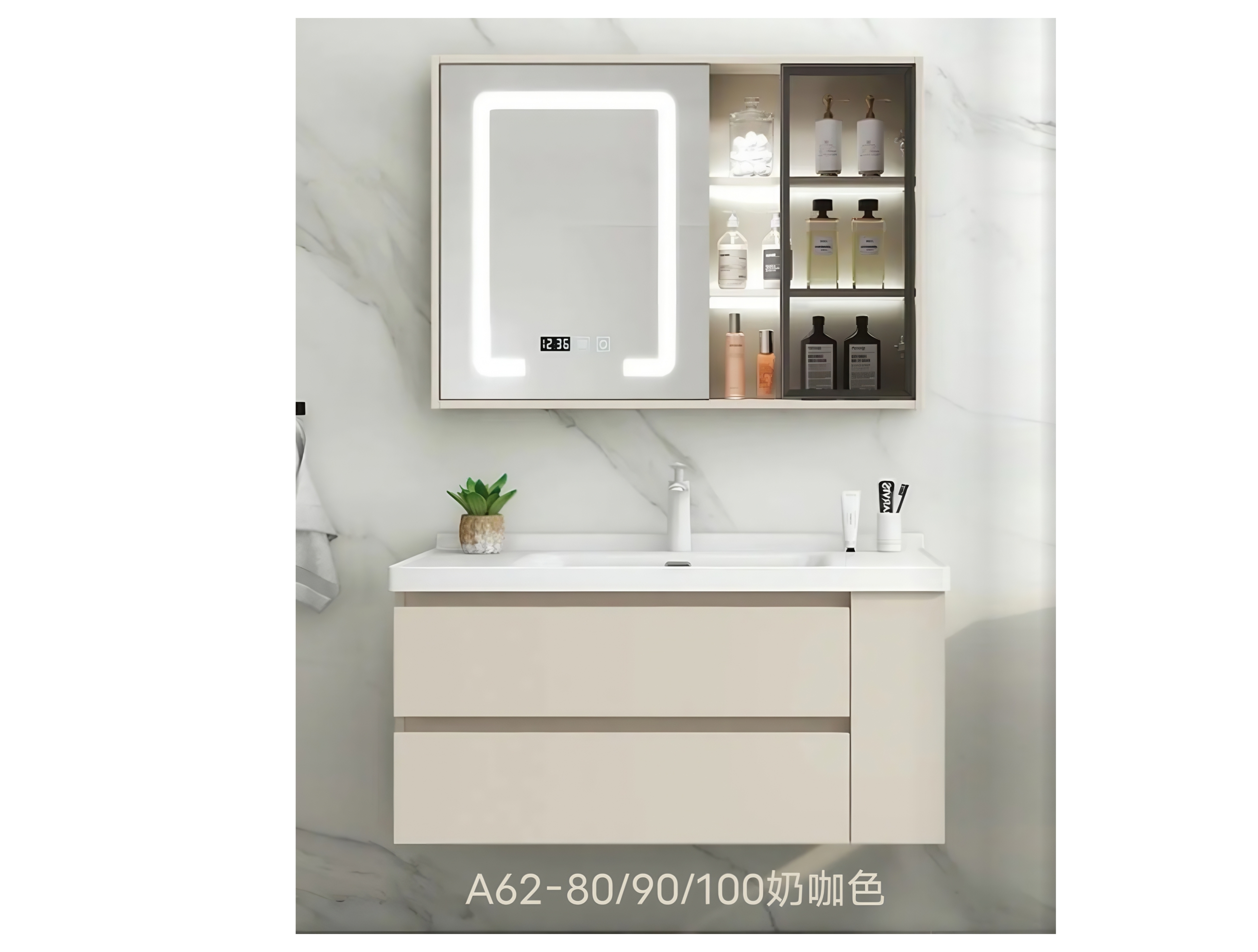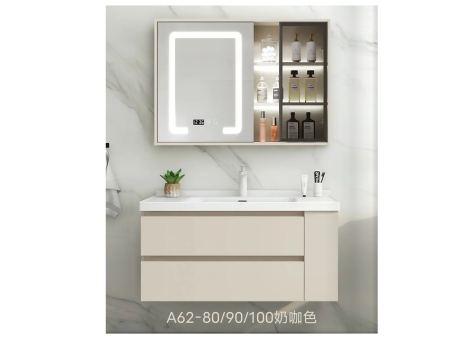 颜色:奶咖色 马桶伴侣浴室柜,伴侣边柜可左右自由安装。80/90/100 款式都是上下双抽设计。